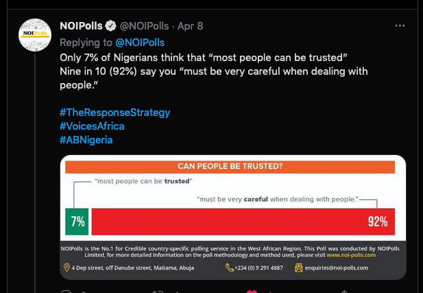 Then I calculated how many more work teams would be needed to surge the number. Realized the objective wasn’t broad coverage. Wondered how much money had been budgeted, how much was released and how much was diverted. I’ve worked on all aspects and in all roles of project management in Nigeria. I know exactly what’s going on. Like any good shopkeeper. So I wasn’t surprised when NOI polls reported that 9 out of 10 Nigerians agreed that you. “must be very careful when dealing with people.” Don’t get it wrong. This corroborates an old HBR report that found only 1 in 10 people were honest by default. Its a global phemon. Truth is, there are little consequences for bad behavior and big consequences for ‘whistleblowing’ globally. Haven’t you heard about Oxfam’s latest adventures in sexploitaion?