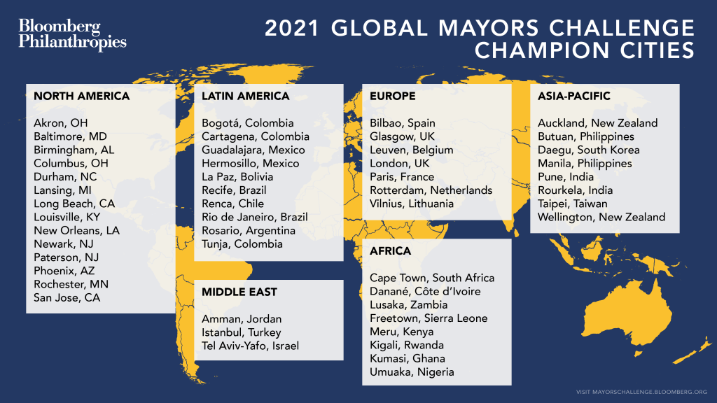 The 2021 Global Mayors Challenge builds on the success of four previous Bloomberg-sponsored Challenges in the U.S. (2013 and 2018), Europe (2014), and Latin America and the Caribbean (2016). For more information, visit mayorschallenge.bloomberg.org and @BloombergCities on Twitter and Instagram.